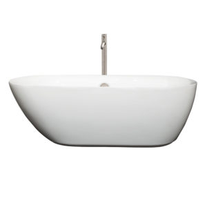 Rebecca 65 inch Freestanding Bathtub in White with Floor Mounted Faucet, Drain and Overflow Trim in Brushed Nickel