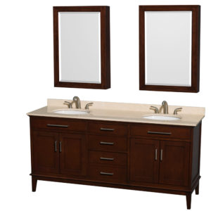 Hatton 72 inch Double Bathroom Vanity in Dark Chestnut, Ivory Marble Countertop, Undermount Oval Sinks, and Medicine Cabinets