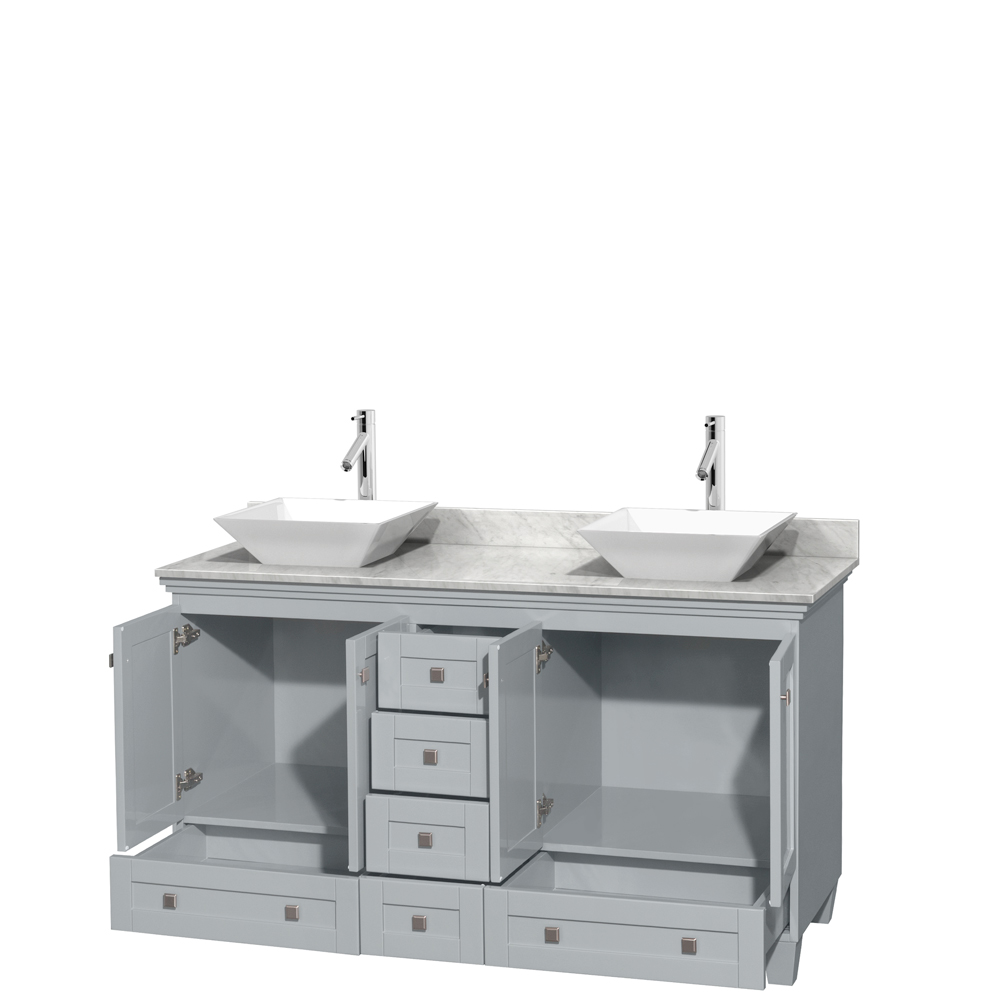 Sublimely linking traditional and modern design aesthetics, and part of the exclusive Wyndham Collection designer series by Christopher Grubb, the Acclaim vanity is at home in almost every bathroom decor. This solid oak vanity blends the simple lines of traditional design with modern elements like vessel sinks and brushed chrome hardware, resulting in a timeless piece of bathroom furniture. The Acclaim is available with a white Carrara or ivory marble counter, porcelain vessel sinks, and matching mirrors. Featuring soft-close door hinges and drawer glides, you’ll never hear a noisy door again. Meticulous attention to detail on this beautiful vanity is second to none and is sure to be envy of your friends and neighbors.
