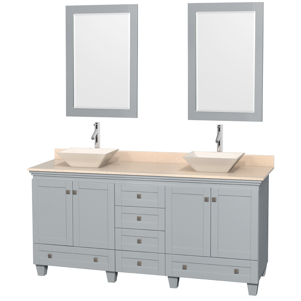 Acclaim 72 inch Double Bathroom Vanity in Oyster Gray, Ivory Marble Countertop, Pyra Bone Porcelain Sinks, and 24 inch Mirrors