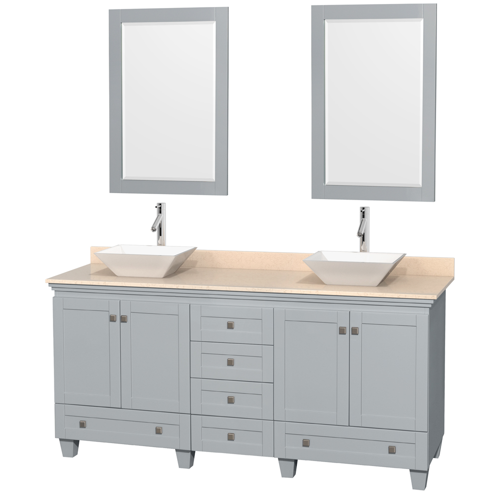 Acclaim 72 inch Double Bathroom Vanity in Oyster Gray, Ivory Marble Countertop, Pyra White Porcelain Sinks, and 24 inch Mirrors