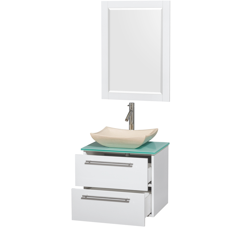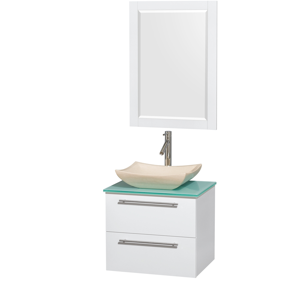 Amare 24 inch Single Bathroom Vanity in Glossy White, Green Glass Countertop, Avalon Ivory Marble Sink, and 24 inch Mirror