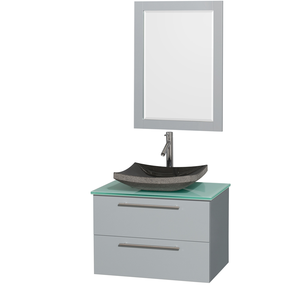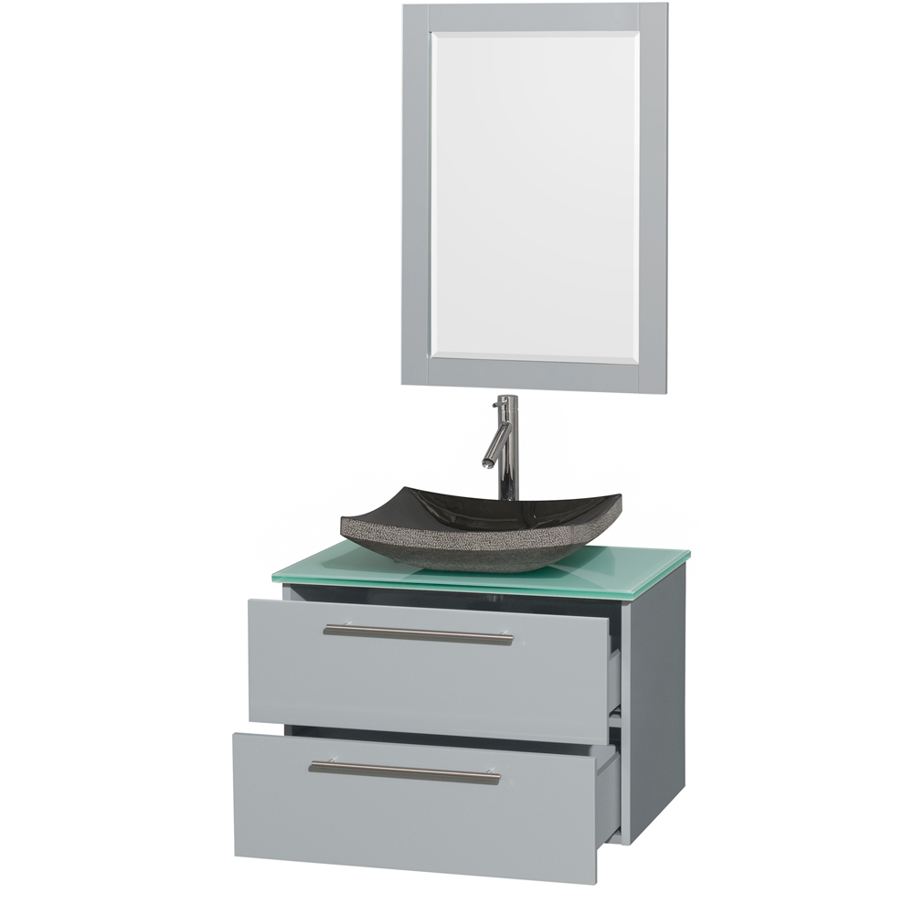 Amare 30 inch Single Bathroom Vanity in Dove Gray, Green Glass Countertop, Altair Black Granite Sink, and 24 inch Mirror
