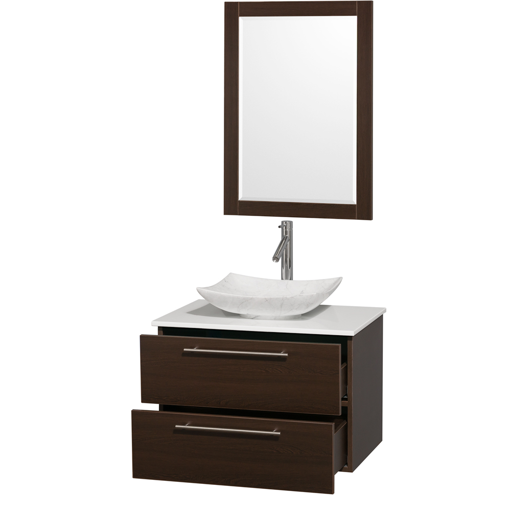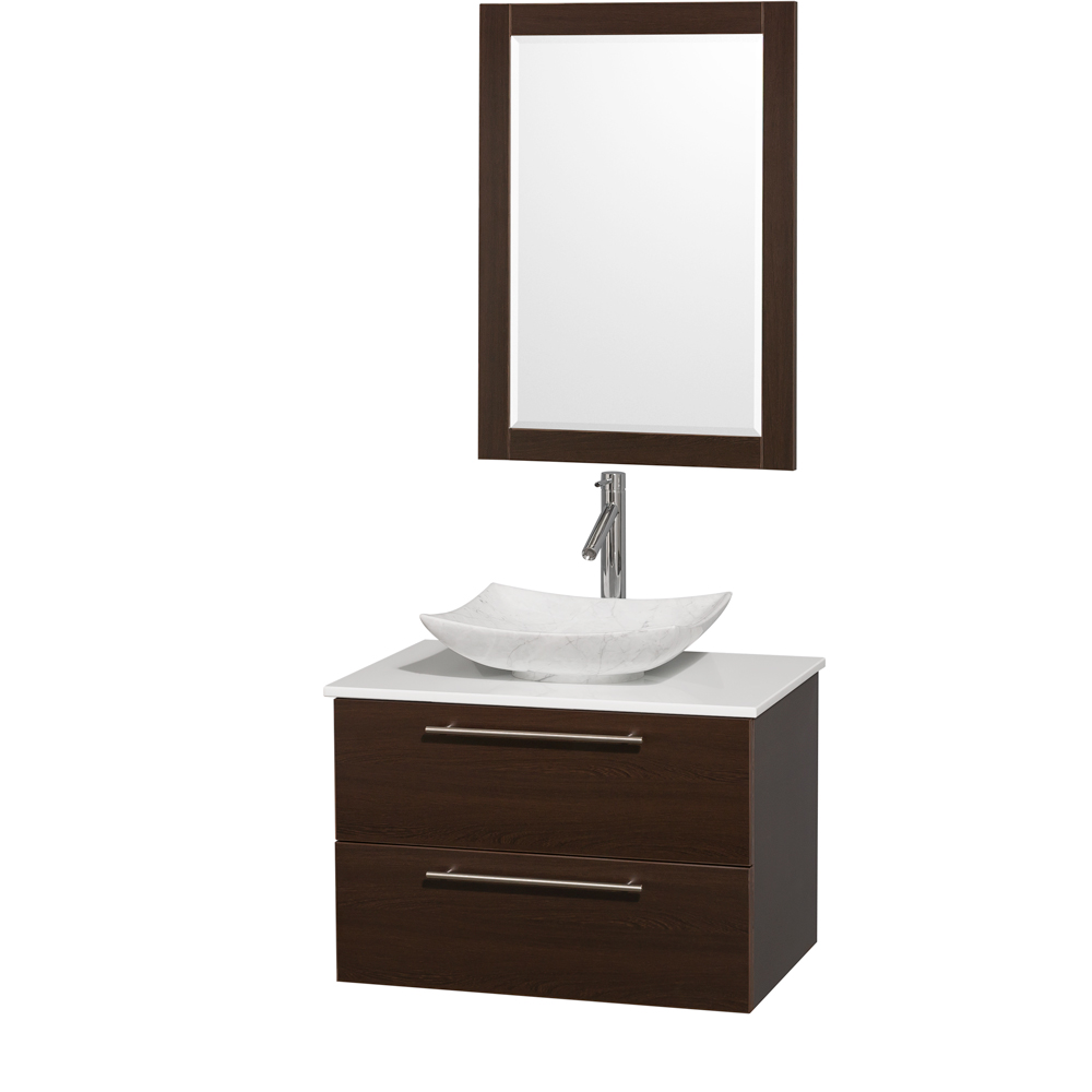 Amare 30 inch Single Bathroom Vanity in Espresso, White Man-Made Stone Countertop, Arista White Carrara Marble Sink, and 24 inch Mirror