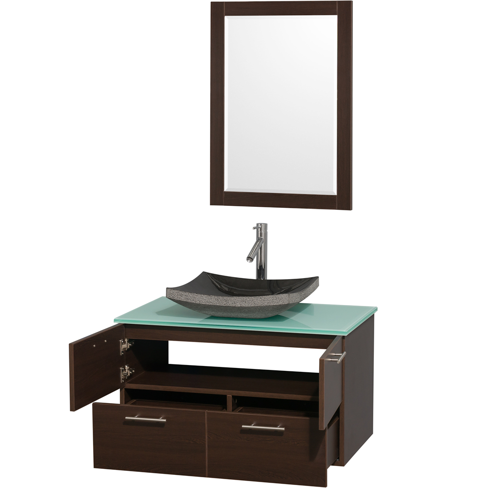 Amare 36 inch Single Bathroom Vanity in Espresso with Green Glass Top with Black Granite Sink, and 24 inch Mirror