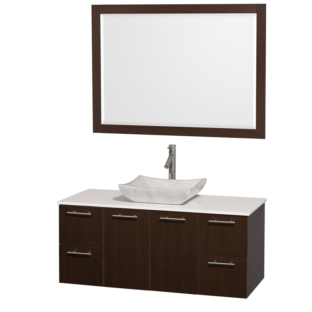 Amare 48 inch Single Bathroom Vanity in Espresso with White Man-Made Stone Top with Carrara Marble Sink, and 46 inch Mirror