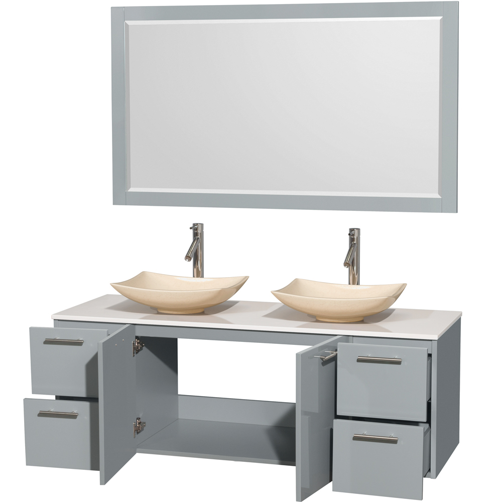 Amare 60 inch Double Bathroom Vanity in Dove Gray, White Man-Made Stone Countertop, Arista Ivory Marble Sinks, and 58 inch Mirror