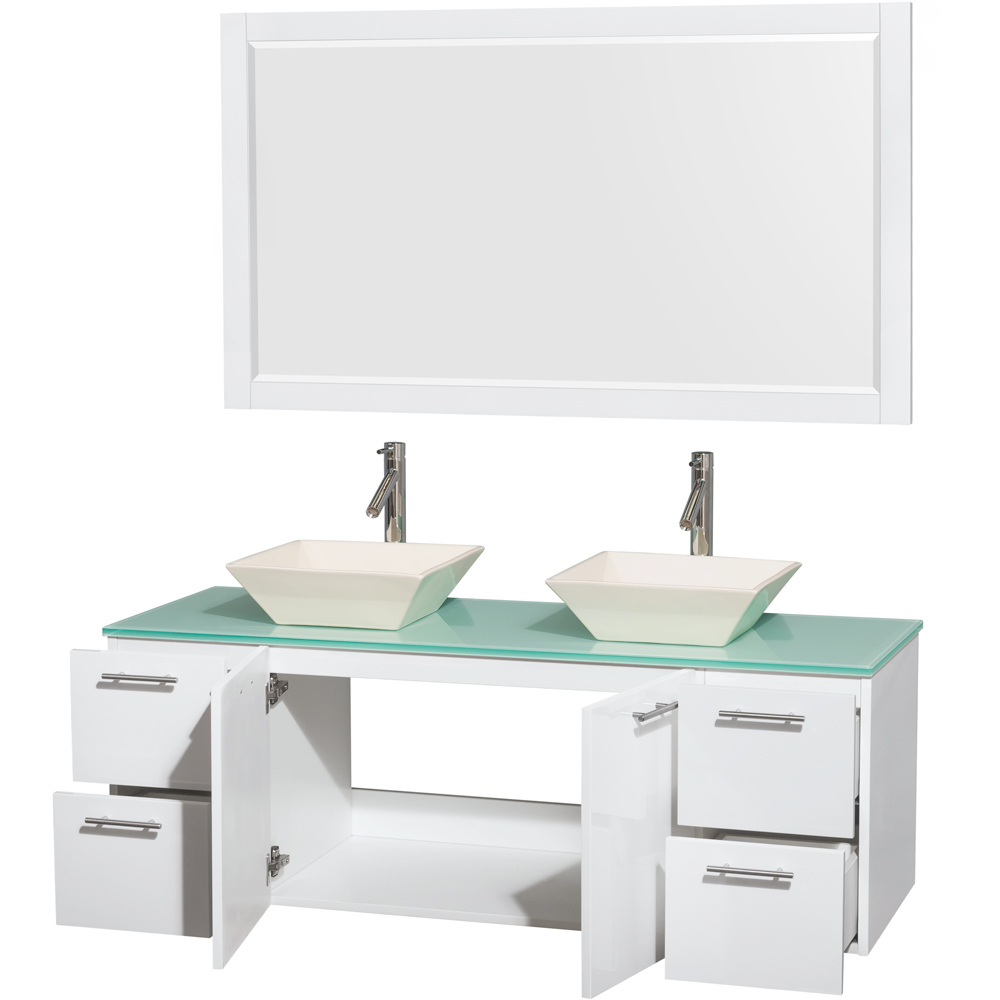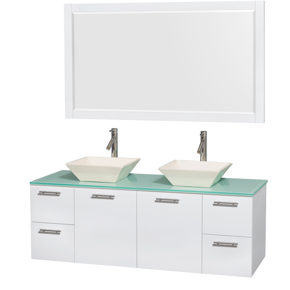 Amare 60 inch Double Bathroom Vanity in Glossy White, Green Glass Countertop, Pyra Bone Porcelain Sinks, and 58 inch Mirror