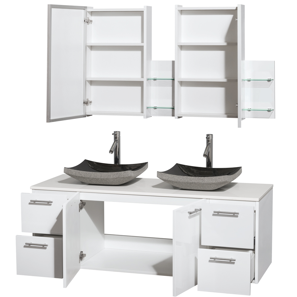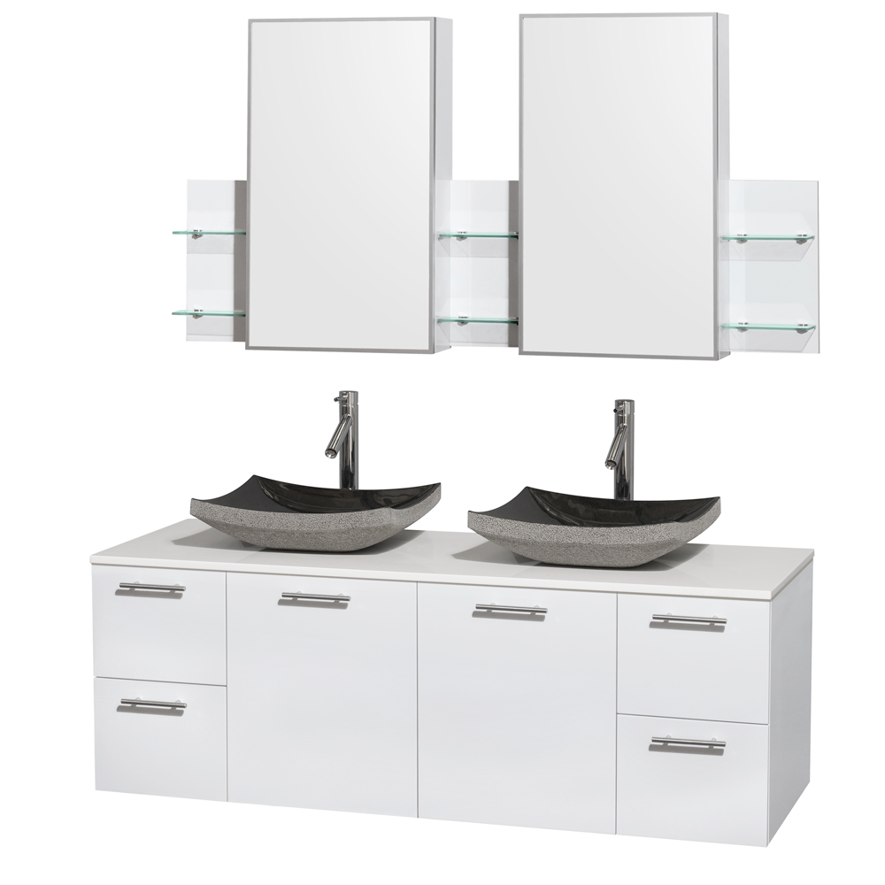 Amare 60 inch Double Bathroom Vanity in Glossy White, White Man-Made Stone Countertop, Altair Black Granite Sinks, and Medicine Cabinets