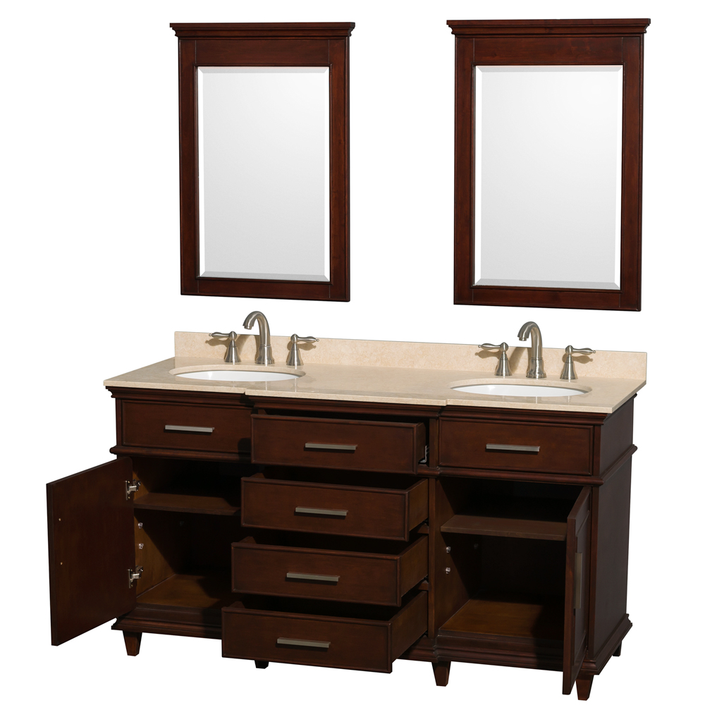 Berkeley 60 inch Double Bathroom Vanity in Dark Chestnut with Ivory Marble Top with White Undermount Oval Sinks and 24 inch Mirrors