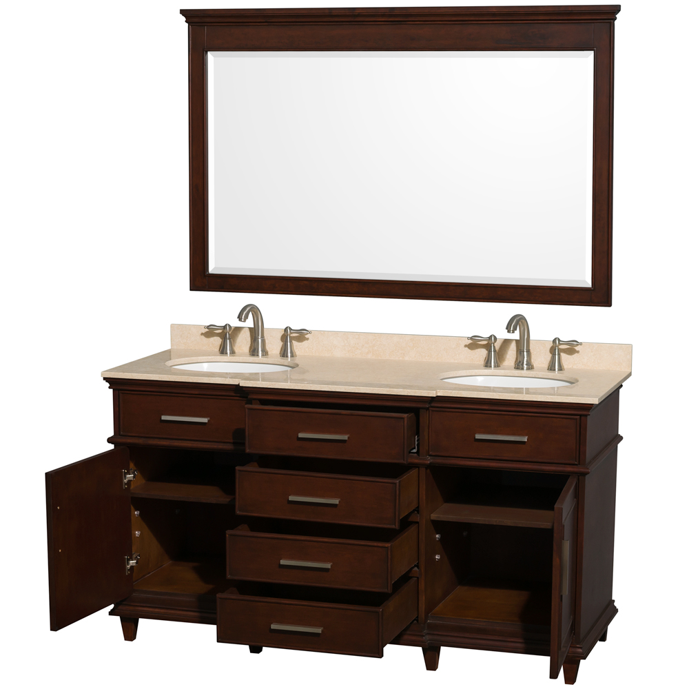 Berkeley 60 inch Double Bathroom Vanity in Dark Chestnut with Ivory Marble Top with White Undermount Oval Sinks and 56 inch Mirror