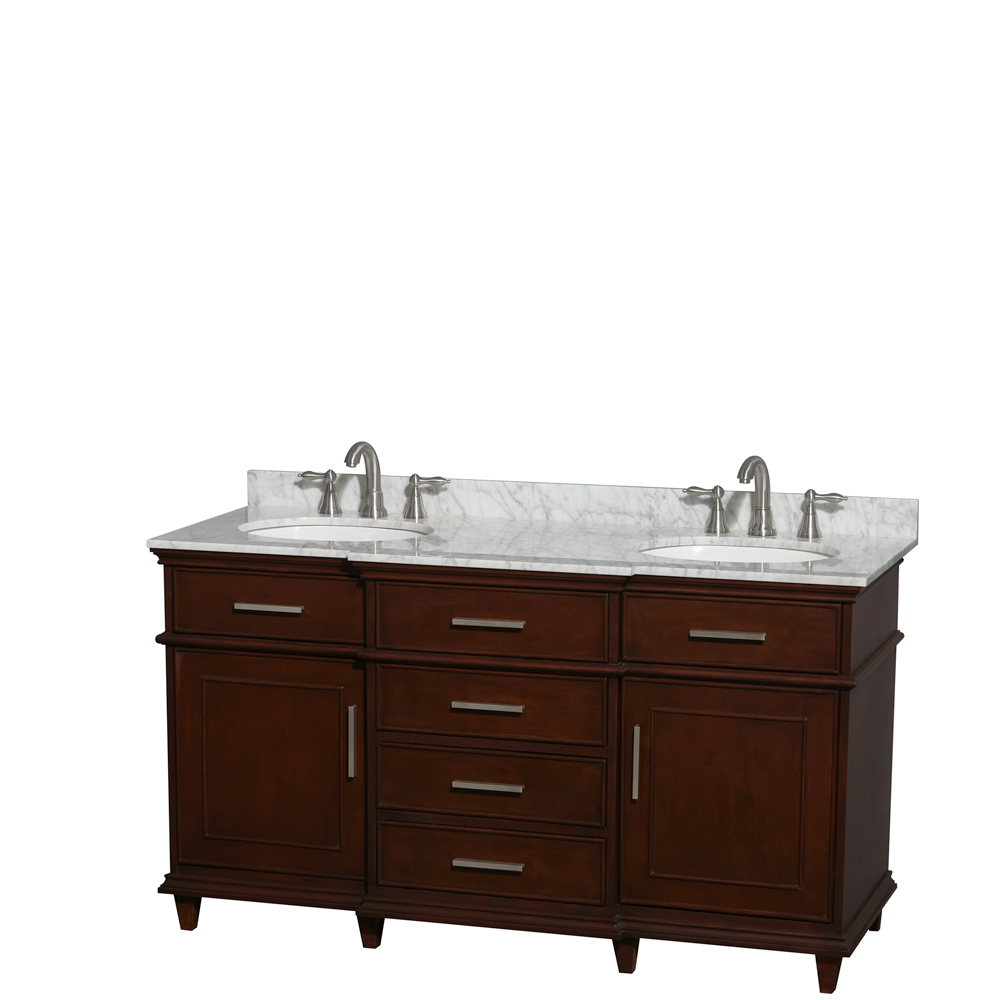 Berkeley 60 inch Double Bathroom Vanity in Dark Chestnut with White Carrara Marble Top with White Undermount Oval Sinks and No Mirror