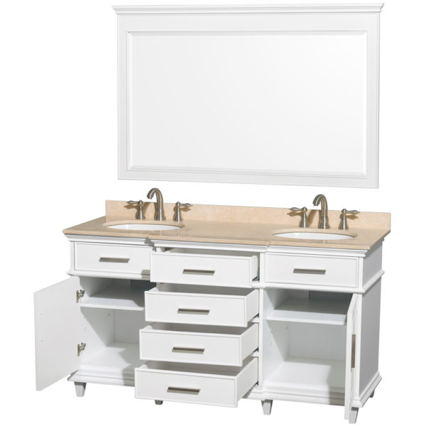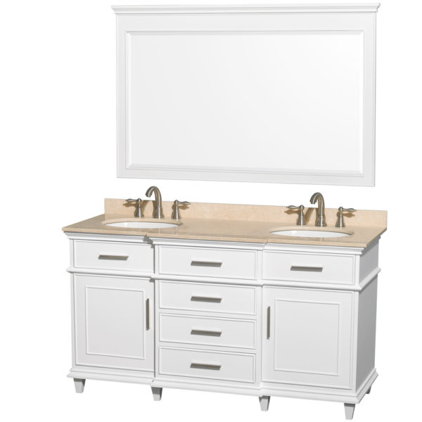 Berkeley 60 inch Double Bathroom Vanity in White with Ivory Marble Top with White Undermount Oval Sinks and 56 inch Mirror