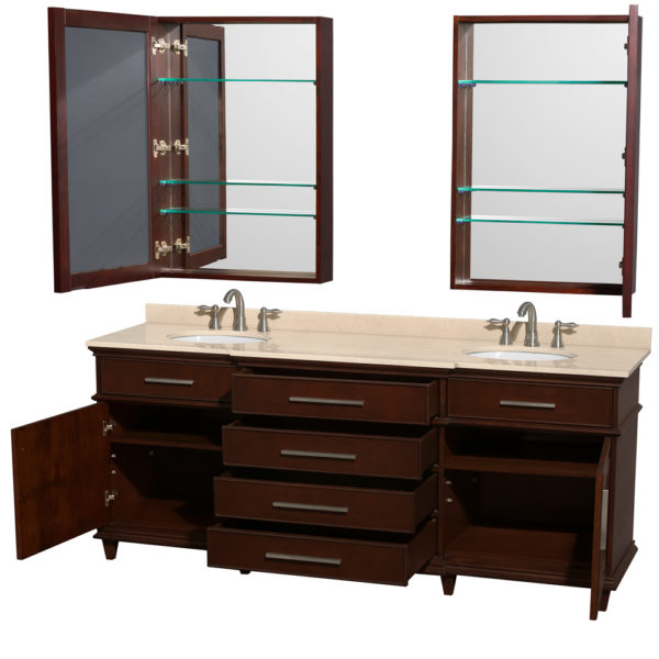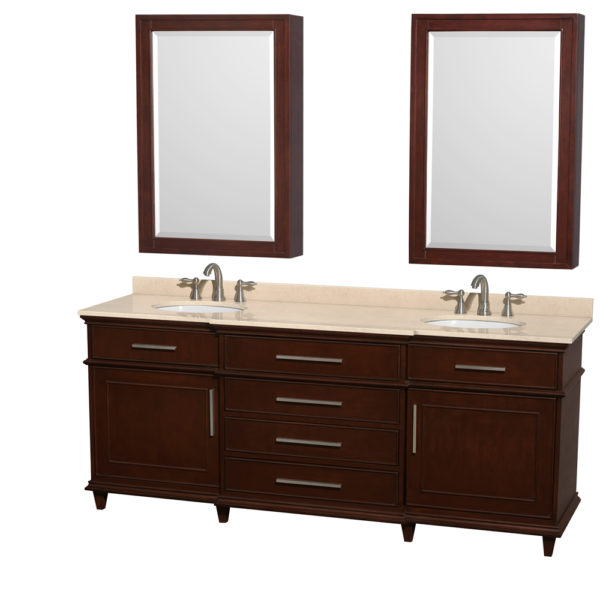 Berkeley 80 inch Double Bathroom Vanity in Dark Chestnut, Ivory Marble Countertop, Undermount Round Sinks, 24 inch Medicine Cabinets