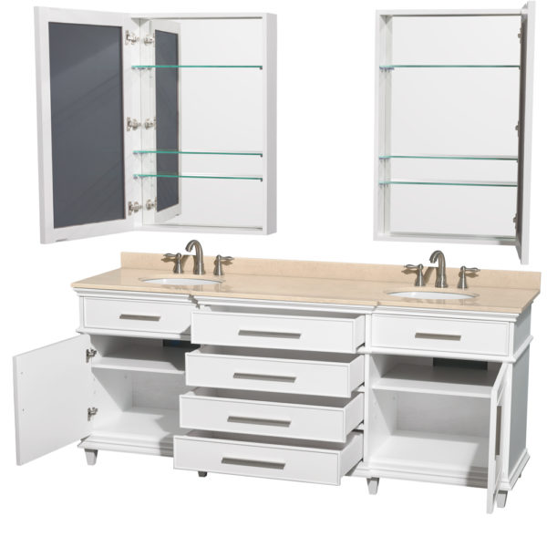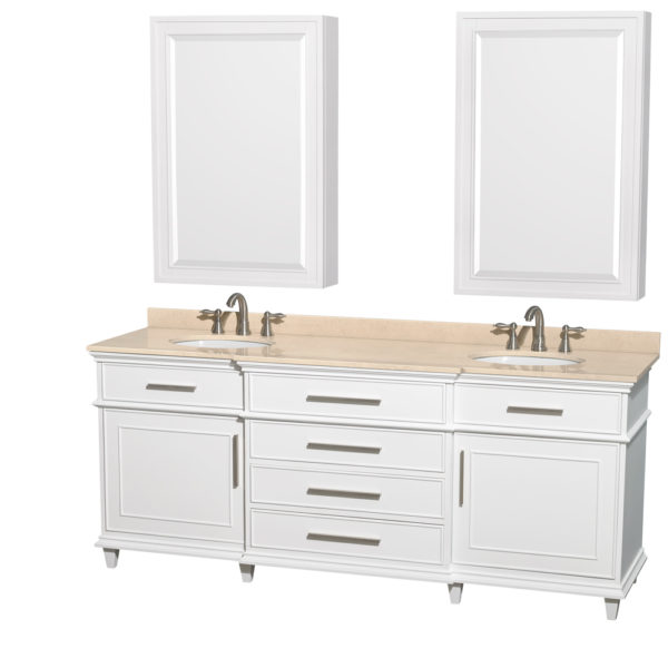 Berkeley 80 inch Double Bathroom Vanity in White, Ivory Marble Countertop, Undermount Round Sinks, 24 inch Medicine Cabinets