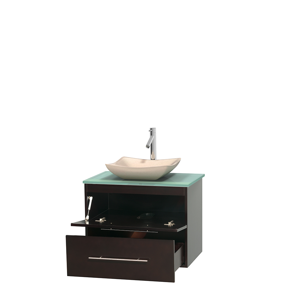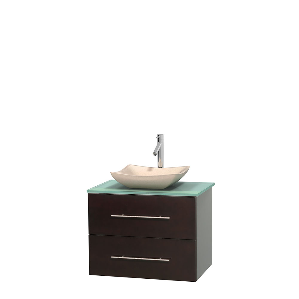 Centra 30 inch Single Bathroom Vanity in Espresso, Green Glass Countertop, Avalon Ivory Marble Sink, and No Mirror