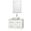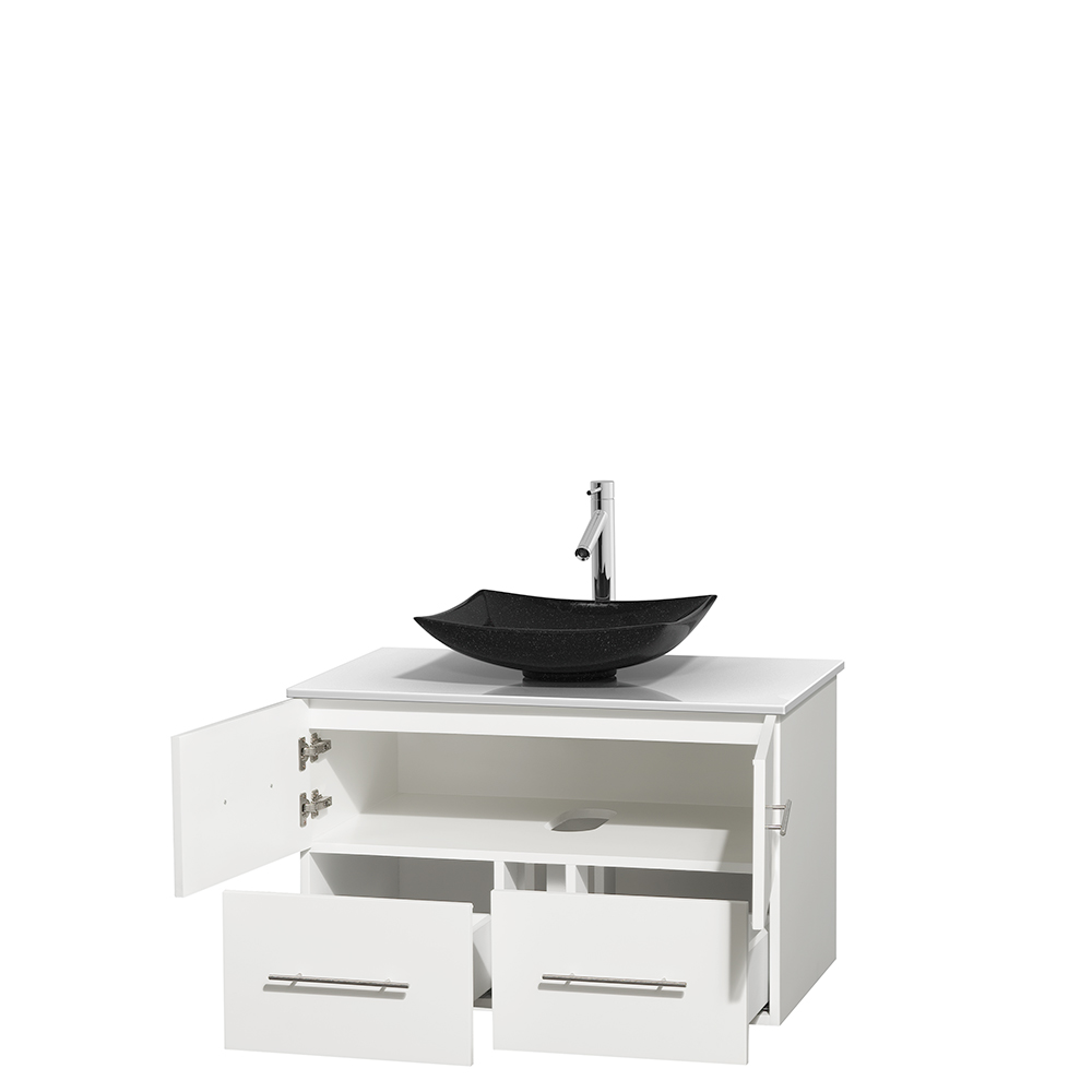 Simplicity and elegance combine in the perfect lines of the Centra vanity by the Wyndham Collection. If cutting-edge contemporary design is your style then the Centra vanity is for you – modern, chic and built to last a lifetime. Available with green glass, pure white man-made stone, ivory marble or white Carrara marble counters, with stunning vessel or undermount sink(s) and matching mirror(s). Featuring soft-close door hinges, drawer glides, and meticulously finished with brushed chrome hardware. The attention to detail on this beautiful vanity is second to none.