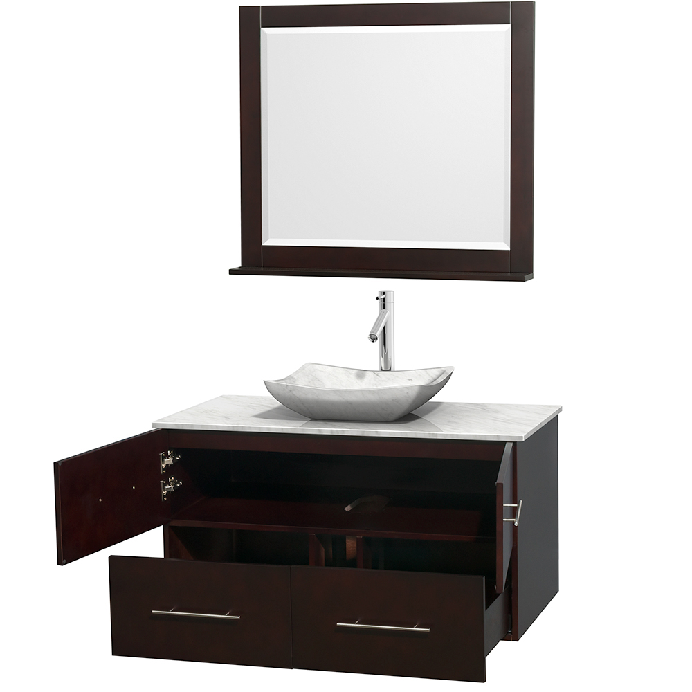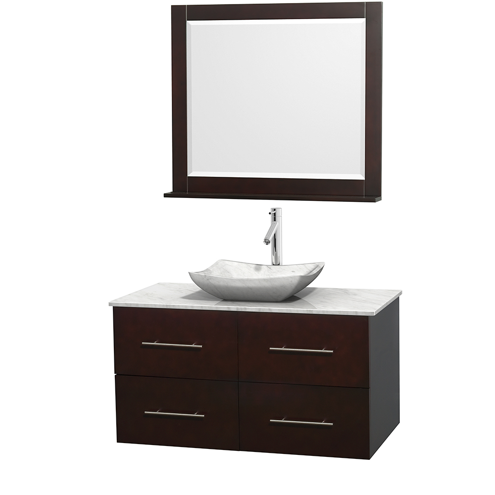 Centra 42 inch Single Bathroom Vanity in Espresso, White Carrara Marble Countertop, Avalon White Carrara Marble Sink, and 36 inch Mirror