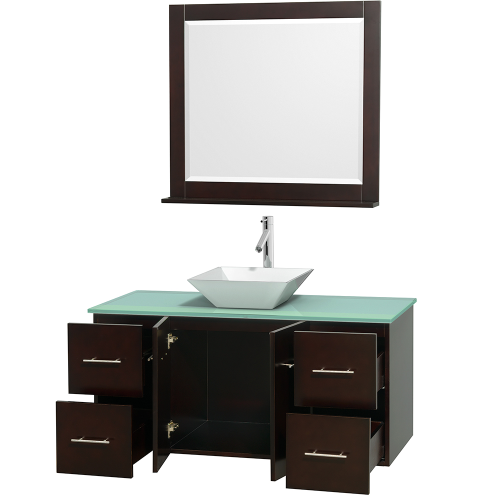 Centra 48 inch Single Bathroom Vanity in Espresso, Green Glass Countertop, Pyra White Porcelain Sink, and 36 inch Mirror