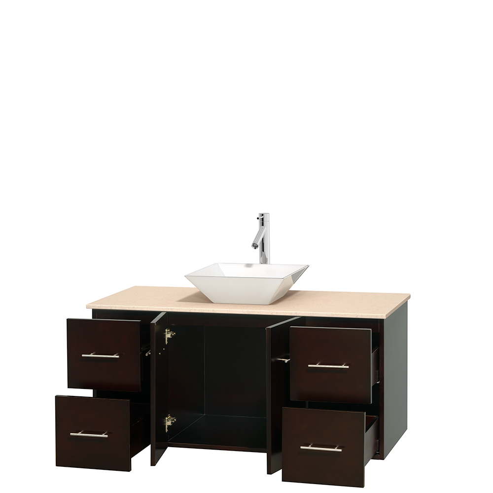 Simplicity and elegance combine in the perfect lines of the Centra vanity by the Wyndham Collection. If cutting-edge contemporary design is your style then the Centra vanity is for you – modern, chic and built to last a lifetime. Available with green glass, pure white man-made stone, ivory marble or white Carrara marble counters, with stunning vessel or undermount sink(s) and matching mirror(s). Featuring soft-close door hinges, drawer glides, and meticulously finished with brushed chrome hardware. The attention to detail on this beautiful vanity is second to none.