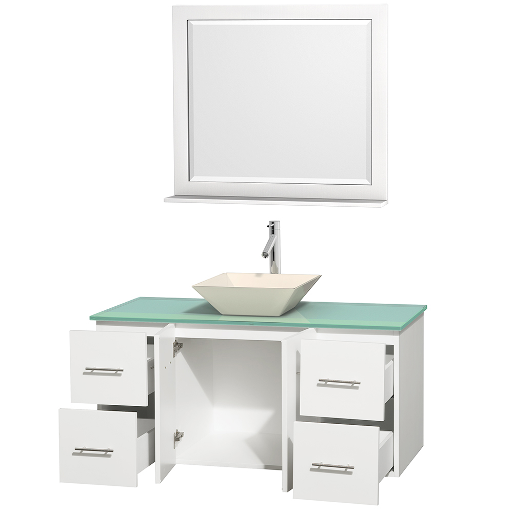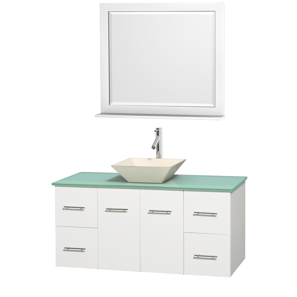 Centra 48 inch Single Bathroom Vanity in Matte White, Green Glass Countertop, Pyra Bone Porcelain Sink, and 36 inch Mirror