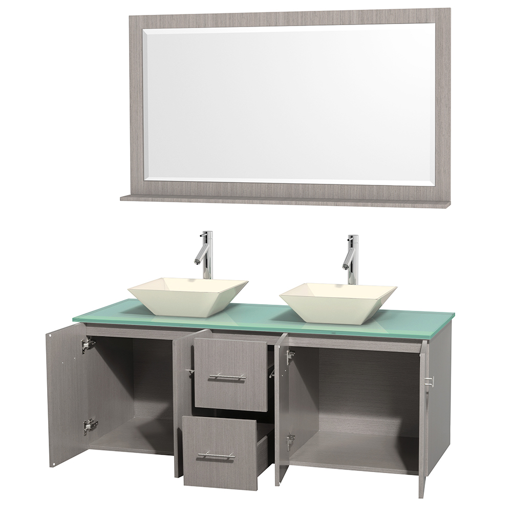 Centra 60 inch Double Bathroom Vanity in Gray Oak, Green Glass Countertop, Pyra Bone Porcelain Sinks, and 58 inch Mirror