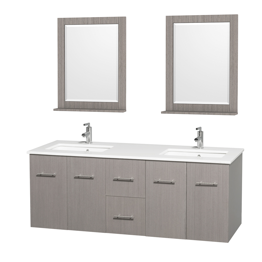 Centra 60 inch Double Bathroom Vanity in Gray Oak, White Man-Made Stone Countertop, Undermount Square Sink, and 24 inch Mirrors