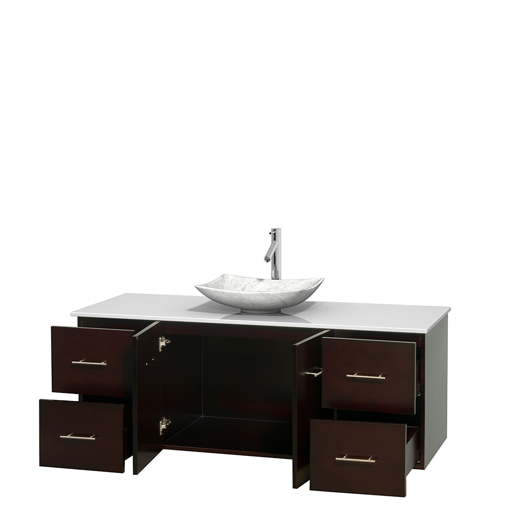 Simplicity and elegance combine in the perfect lines of the Centra vanity by the Wyndham Collection. If cutting-edge contemporary design is your style then the Centra vanity is for you – modern, chic and built to last a lifetime. Available with green glass, pure white man-made stone, ivory marble or white Carrara marble counters, with stunning vessel or undermount sink(s) and matching mirror(s). Featuring soft-close door hinges, drawer glides, and meticulously finished with brushed chrome hardware. The attention to detail on this beautiful vanity is second to none.