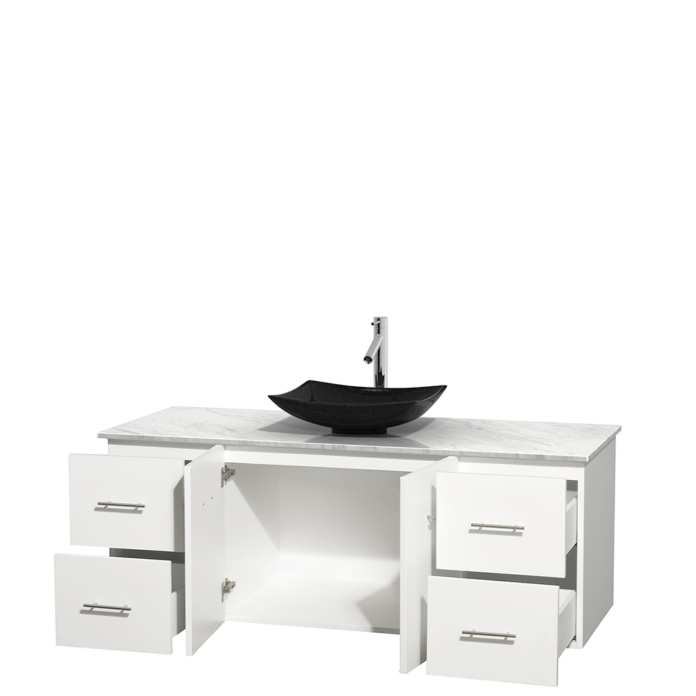 Centra 60 inch Single Bathroom Vanity in Matte White, White Carrara Marble Countertop, Arista Black Granite Sink, and No Mirror
