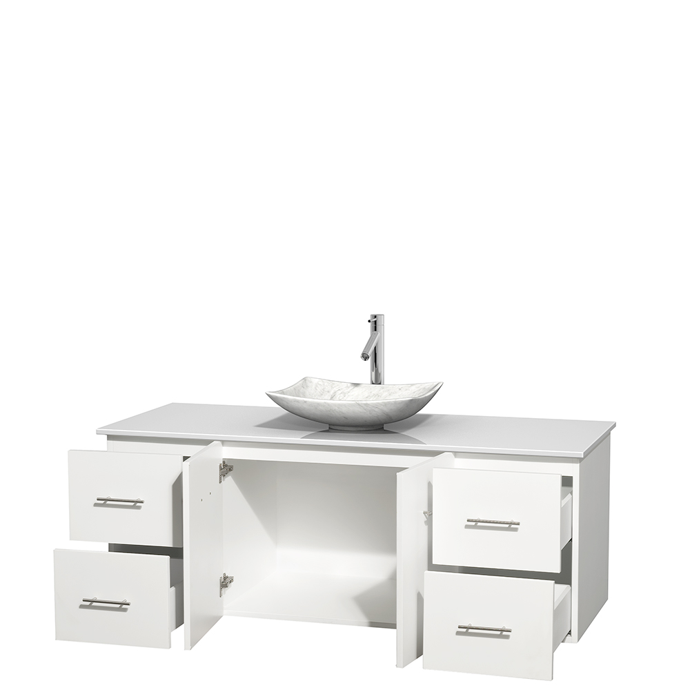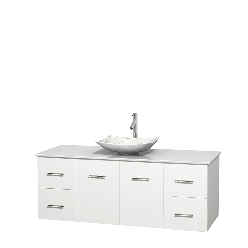 Centra 60 inch Single Bathroom Vanity in Matte White, White Man-Made Stone Countertop, Arista White Carrara Marble Sink, and No Mirror