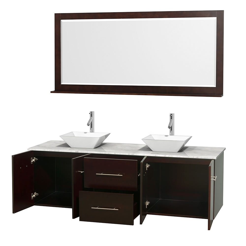 Centra 72 inch Double Bathroom Vanity in Espresso, White Carrara Marble Countertop, Pyra White Porcelain Sinks, and 70 inch Mirror