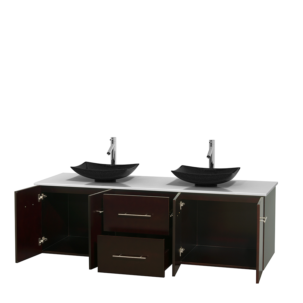 Simplicity and elegance combine in the perfect lines of the Centra vanity by the Wyndham Collection. If cutting-edge contemporary design is your style then the Centra vanity is for you – modern, chic and built to last a lifetime. Available with green glass, pure white man-made stone, ivory marble or white Carrara marble counters, with stunning vessel or undermount sink(s) and matching mirror(s). Featuring soft-close door hinges, drawer glides, and meticulously finished with brushed chrome hardware. The attention to detail on this beautiful vanity is second to none.