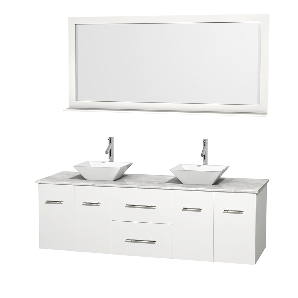 Centra 72 inch Double Bathroom Vanity in Matte White, White Carrara Marble Countertop, Pyra White Porcelain Sinks, and 70 inch Mirror