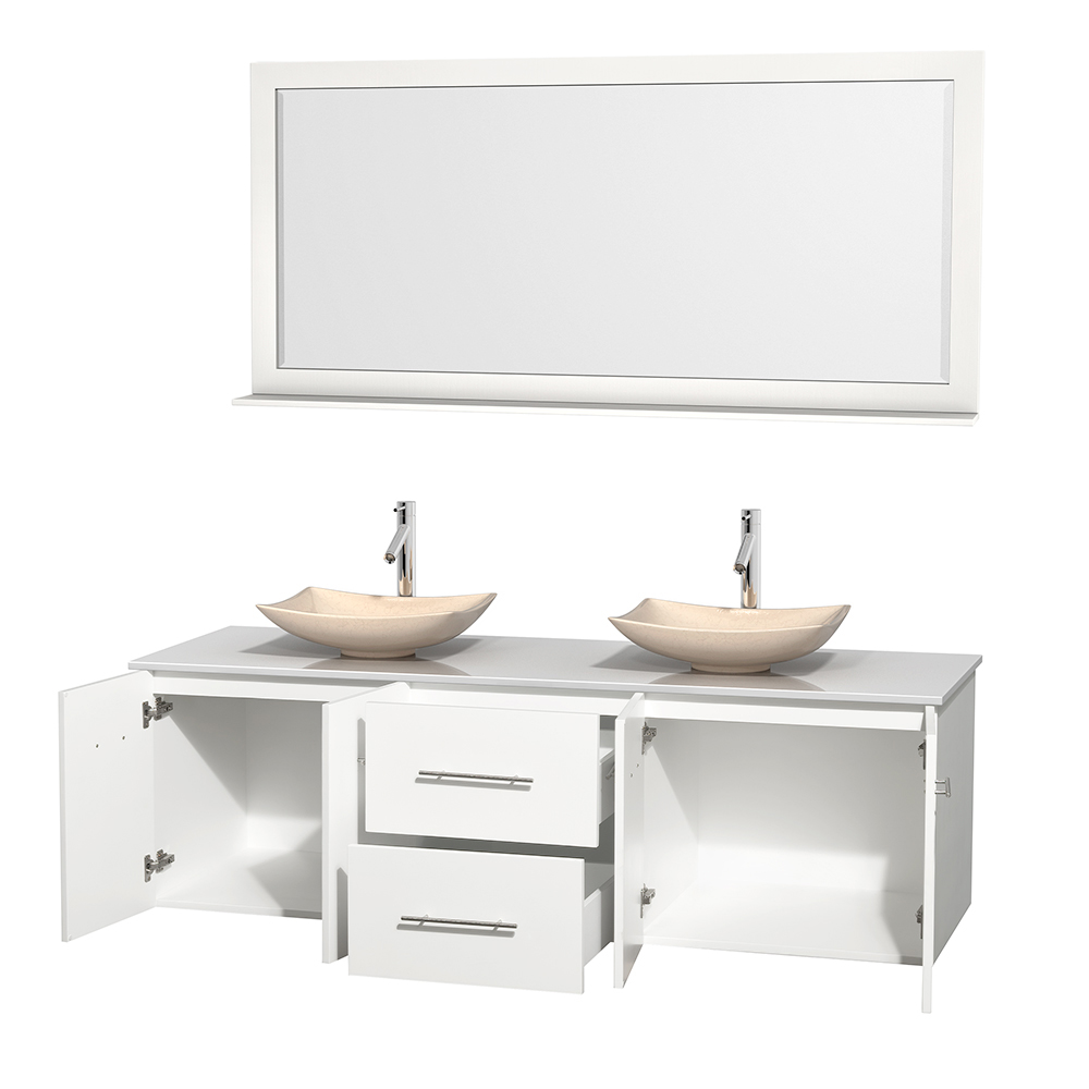 Simplicity and elegance combine in the perfect lines of the Centra vanity by the Wyndham Collection. If cutting-edge contemporary design is your style then the Centra vanity is for you – modern, chic and built to last a lifetime. Available with green glass, pure white man-made stone, ivory marble or white Carrara marble counters, with stunning vessel or undermount sink(s) and matching mirror(s). Featuring soft-close door hinges, drawer glides, and meticulously finished with brushed chrome hardware. The attention to detail on this beautiful vanity is second to none.