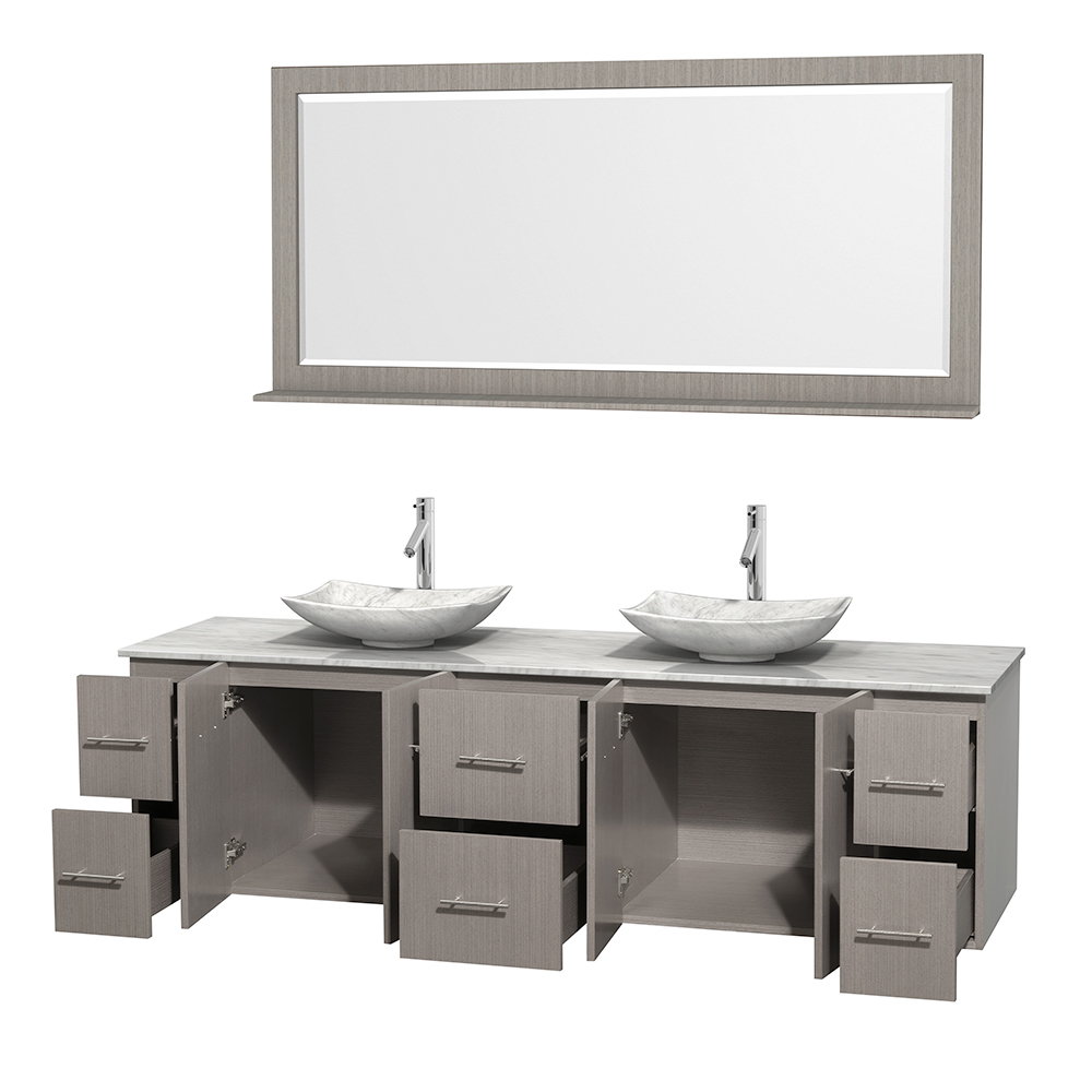 Centra 80 inch Double Bathroom Vanity in Gray Oak, White Carrara Marble Countertop, Arista White Carrara Marble Sinks, and 70 inch Mirror