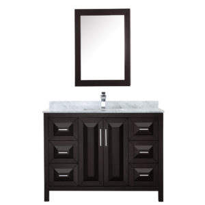 The beautiful Daria collection vanities stand out in any bathroom with strong, clean lines, raised panels and elegant counters with square sinks. There’s plenty of cabinet space, the fully extending drawers are dovetail construction, and chrome detailing completes the look. Daria vanities deftly combine the function of today with a nod to the elegance of the past. It’s the new modern – classic styling with a contemporary twist.