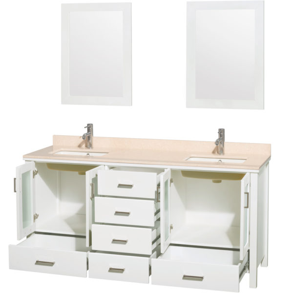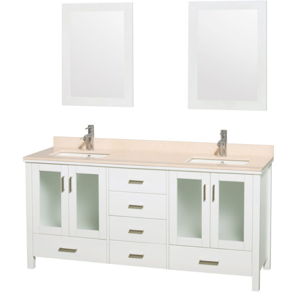 Lucy 72 inch Double Bathroom Vanity in White, Ivory Marble Countertop, Undermount Square White Porcelain Sinks, and 24 inch Mirrors