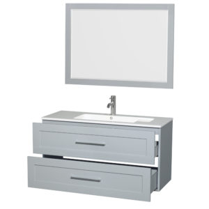 Olivia is a blend of modern and contemporary design, styled to be practical, simple and clean. The finish is a gorgeous glossy coat to really make your bathroom pop. The set includes a matching mirror and white integrated top that is sure to be a crowd pleaser. Olivia bathroom vanities are available in multiple sizes and colors.