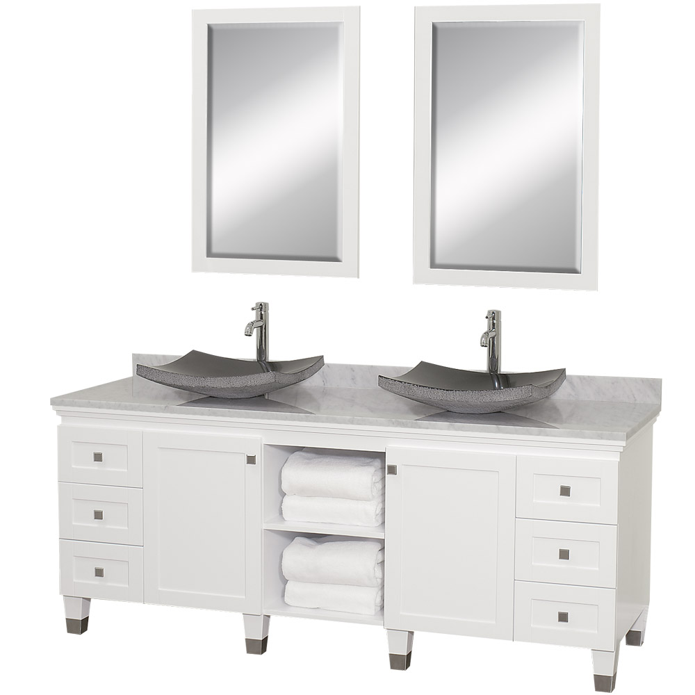 Premiere 72 inch Double Bathroom Vanity in White, White Carrara Marble Countertop, Altair Black Granite Sinks, and 24 inch Mirrors