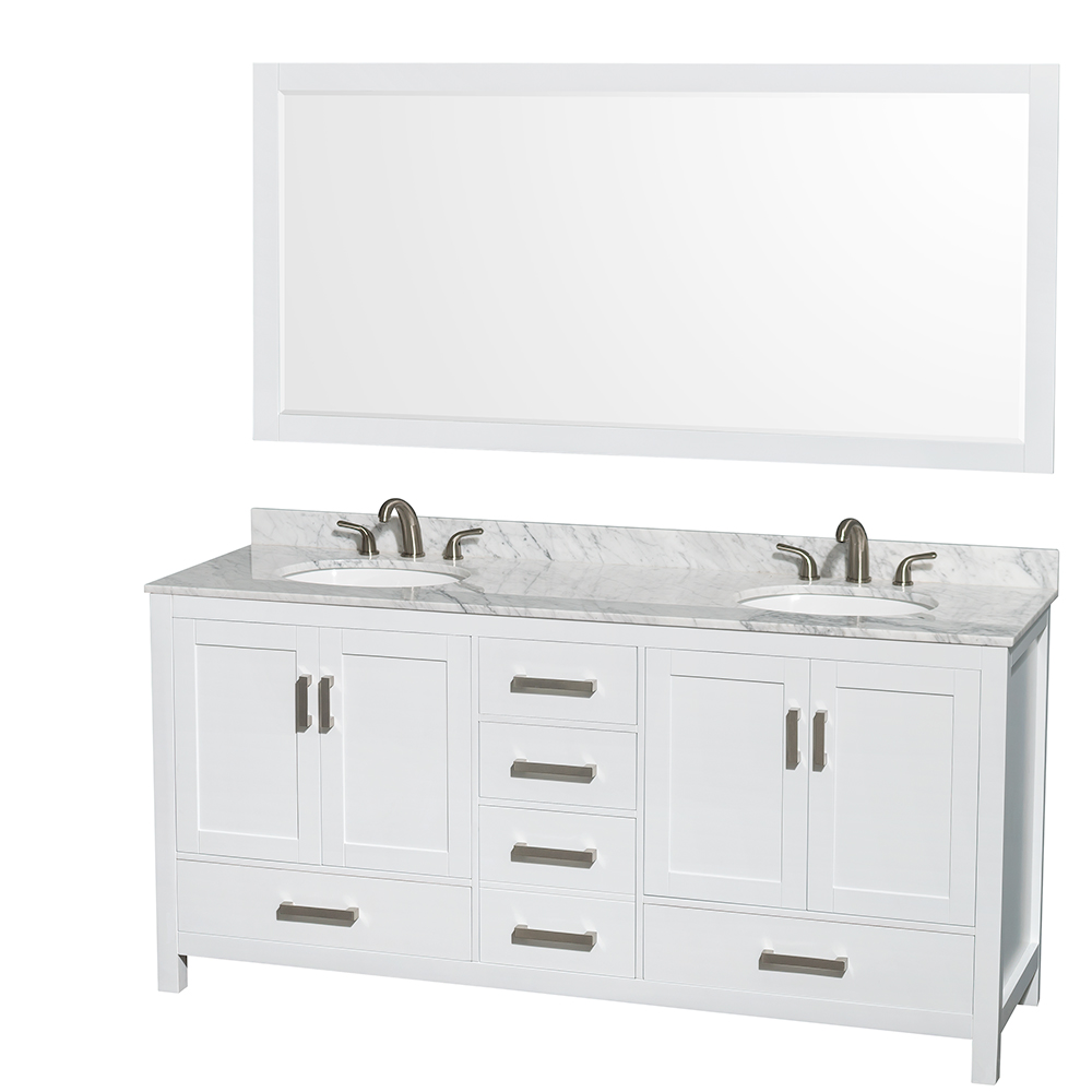 Sheffield 72 inch Double Bathroom Vanity in White, White Carrara Marble Countertop, Undermount Oval Sinks, and 70 inch Mirror